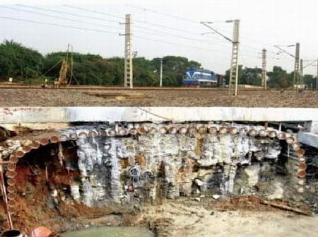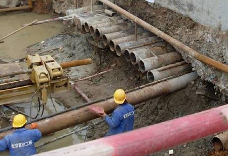 管幕施工時沿隧道軸線方向采用密排法將φ299mm的鋼管水平直線鋪設(shè)在土體里,與隧道外輪廓最小凈距25cm,并在φ299mm鋼管連接處打入φ60mm鋼花管進行管幕內(nèi)外回填注漿,對土體進行注漿加固并使φ299鋼管成為一個整體。在施工過程中確保導(dǎo)向鉆孔精度,然后擴孔與拉管同時完成,并及時注漿,成功控制了地面及鐵路軌面沉降,確保了鐵路正常運行及隧道施工的安全。